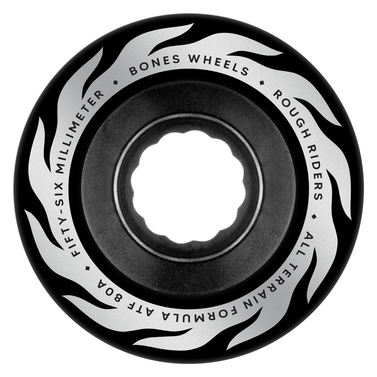 BONES™ Rough Riders • Eternal Flame • ATF • 56mm • 80A • Black UPC: 842357196131 Wheel Core: Yes Wheel Diameter: 56mm Wheel Width: 40mm Wheel Hardness: 80a Wheel Formula: ATF Wheel Color: Black Wheel Suggested Use: All Terrain Wheel Surface: Smooth Wheel Shape: CORE