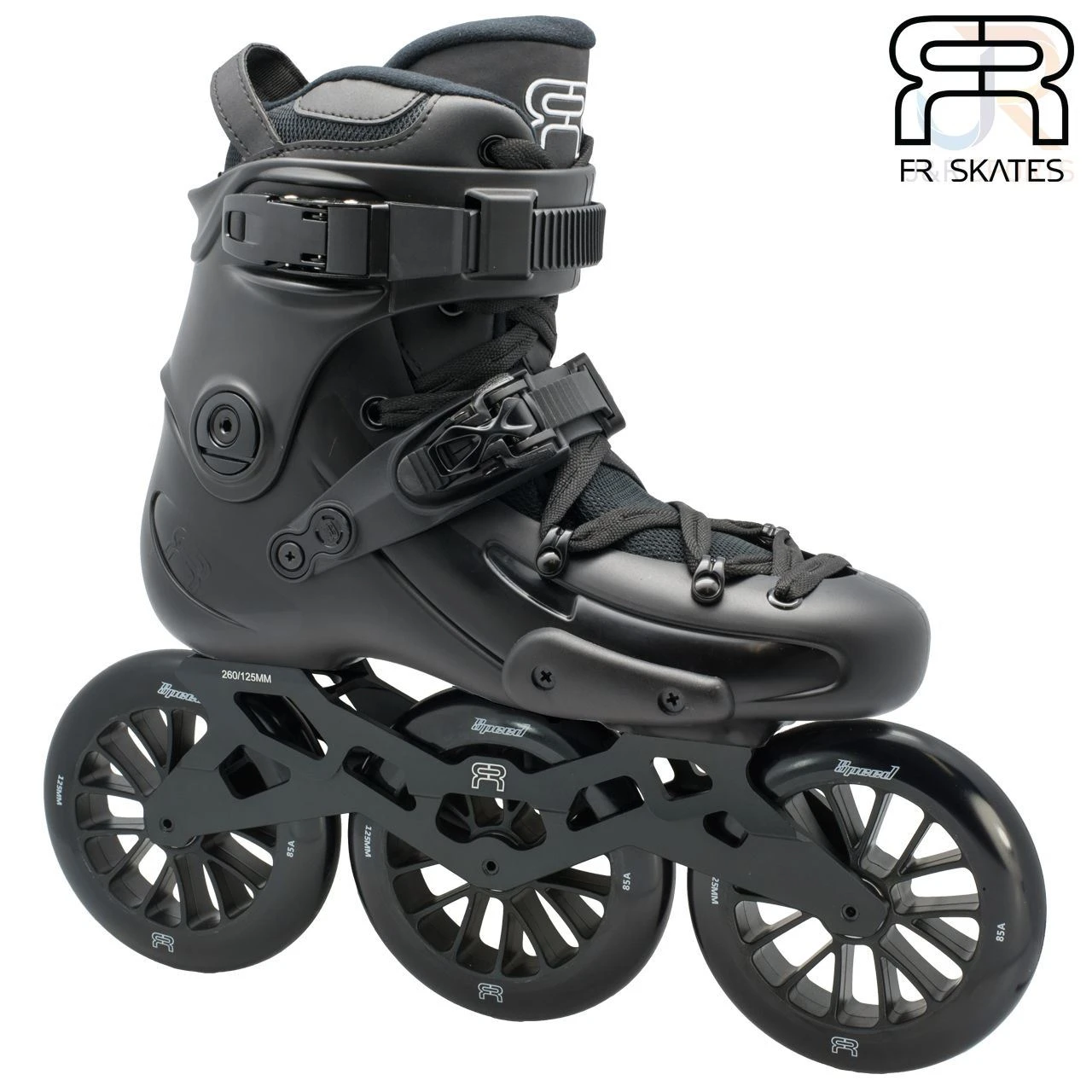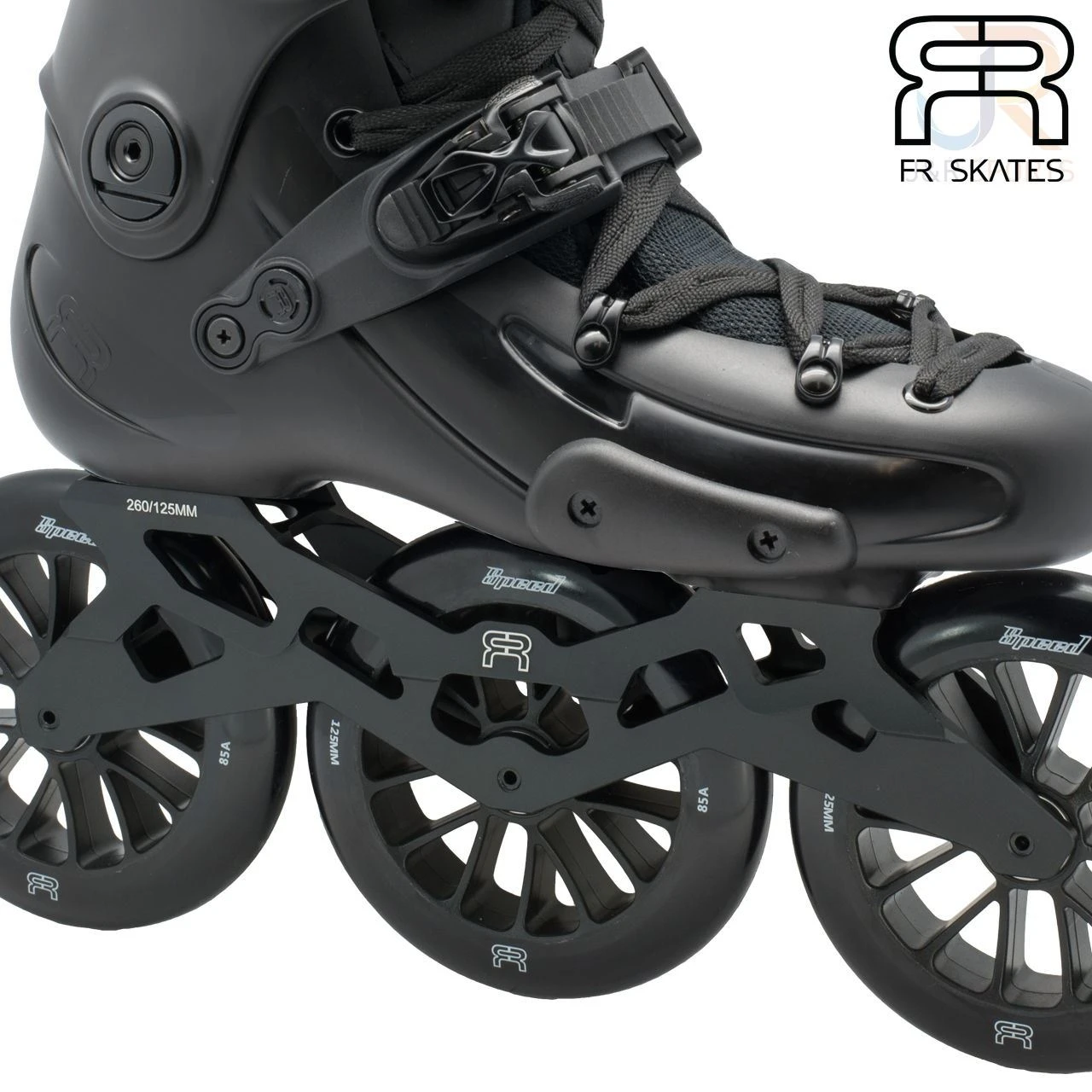 To get the best energy transfer possible from your foot to the ground, FR have added two, seven hole, metal plates to the bottom of their skates, allowing you to adjust the setup of the new three wheel frame with Black, 125mm Speed wheels.