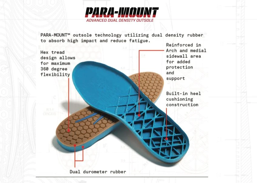 Advanced PARA-MOUNT™ outsole technology utilizes dual density cushioning to absorb high impact. The Hex-tread design combines 360 degree flexibility for increased board feel and maximum grip. Reinforced in the arch area for added protection and support.