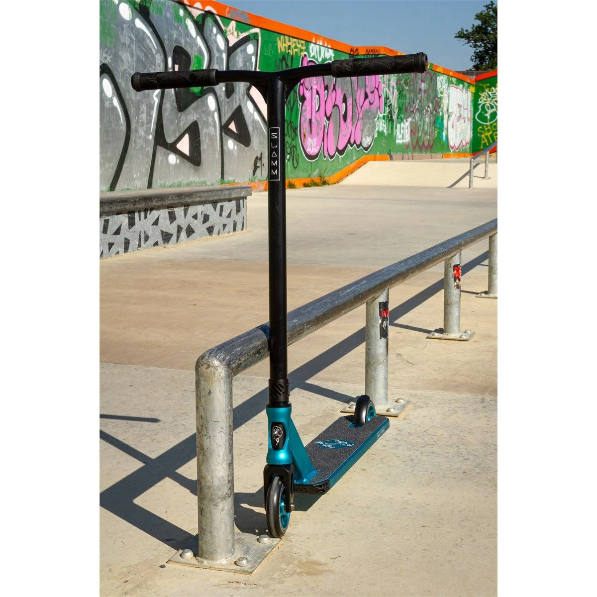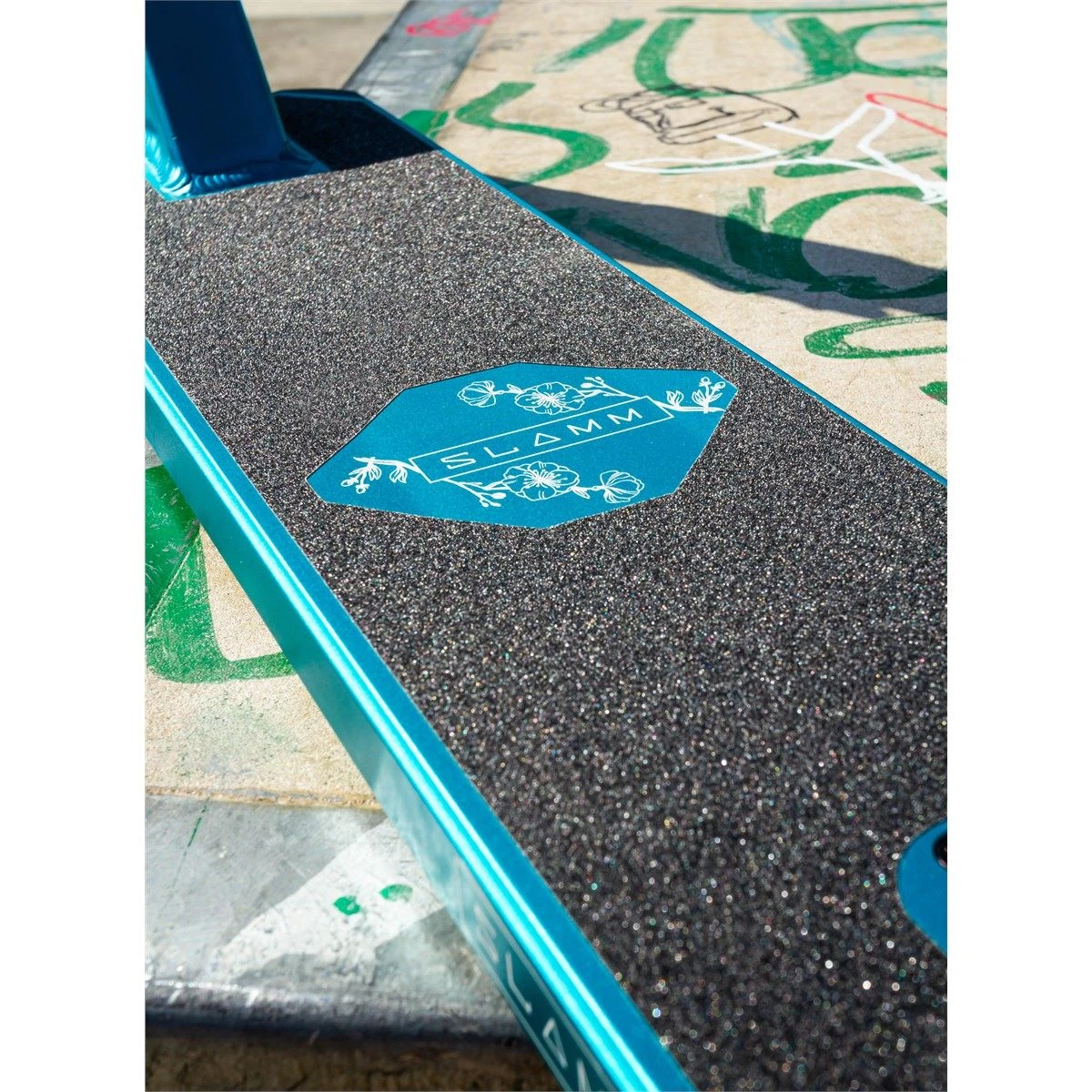 Slamm’s Assault V6 sees yet another modern take on laser etched graphics. Matched anodising from the wheels to the T6 heat treated deck ties the scooter together, contrasting the bright finish to the black details. The Assault V6 comes with all the finishing touches you need such as the impact resistant bar ends and deck blocks, along with 165mm team grips and a double bolt CNC clamp. With a threadless extruded Aluminium fork and ABEC 9 bearings, the Assault V6 is a complete package for any riding style.
