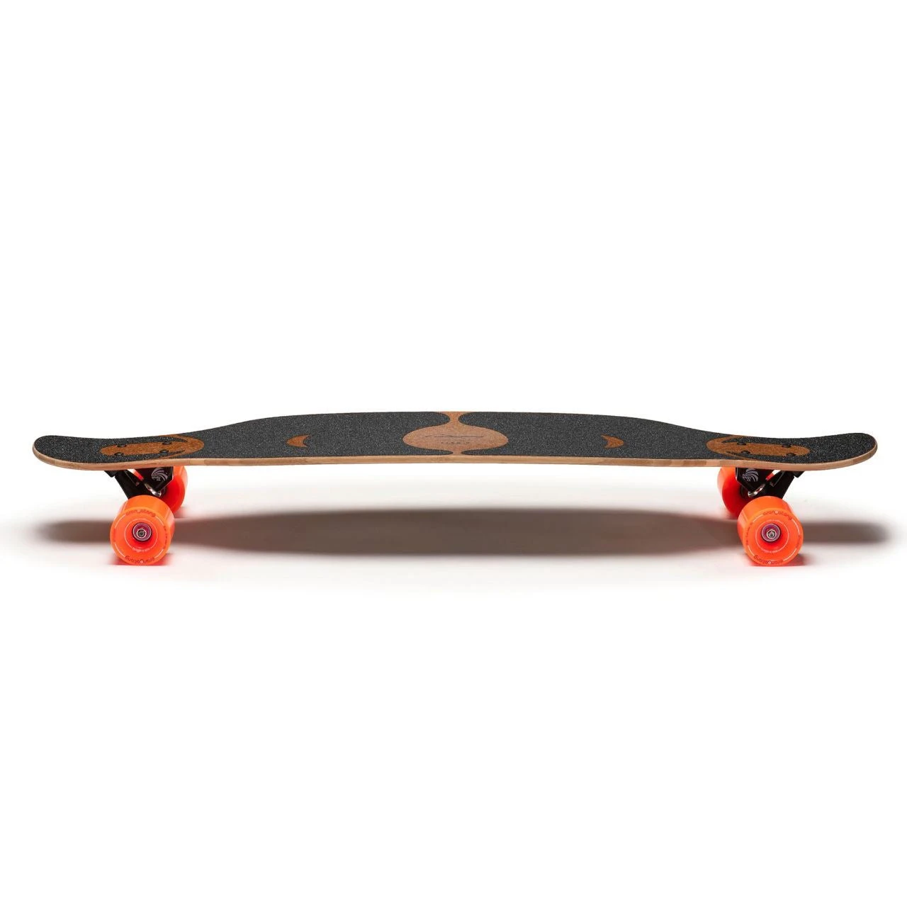 PARTY IN THE FRONT. PARTY IN THE BACK. Staying true to Loaded’s foundational passion for carving and pumping in a lively flex-camber profile, the Loaded SymTail also empowers riders to explore freestyle and dancing maneuvers with its symmetrical shape and nose and tail kicks. It’s a classic concept for a contemporary carver looking to pump and flow through parking garages, city streets, back roads, and anywhere in between. It’s Right for You If……. You want a lively carving and pumping experience in Loaded’s classic flexy camber construction. You have an active riding style and want your board to return every bit of energy that you put in. You like to mix up your turns with some dancing and freestyle flavor. Specifications: Length: 39.5IN / 100 cm Width: 8.75IN / 22.2 cm Wheelbase: 27IN / 68.6 cm Profile: Camber Flex: Flexy Deck Weight: 2.7 lbs / 1.2 Kg Disciplines: Carving & Pumping Trucks: Paris V3 165mm 50° (Jet Black) Wheels: Orangatang 70mm 4President or 73mm BeefCake Bearings: Loaded Jehu V2 Bearings Hardware: Loaded 1.0IN Button Head Hardware Flex Recommendations: Flex 1: 170 – 270+ lbs / 77 – 122+ Kg’s Flex 2: 125 – 215+ lbs / 57 – 98+ Kg’s Features: Design Evolution: The SymTail carries on the board model family heritage that began with the PinTail in 2004 and evolved into the FatTail in 2011. As dancing and freestyle became increasingly intertwined with carving and pumping, the original board’s once-minimalist tail grew iteratively larger and more function driven with the FatTail and has now sprouted a fully symmetric nasal counterpart with the SymTail in 2024. The SymTail was designed in collaboration with Loaded ambassador Ari Chamasmany, who championed the FatTail’s versatility with his inimitable riding style blend of pumping, dancing, and sliding. Functional Design: The SymTail’s outline shape is designed for finely tuned and even flex. Mild concave braces your feet for quick carving, while the topmount camber platform provides responsive performance tailored toward an active riding style. Twin-taper shape with generous wheel cutouts provides ample turning leverage while maximizing clearance for loose trucks, deep turns, and a wide range of wheel sizes without the need for risers. Mellow upturned nose and tail with additional fiberglass reinforcement for stiffer response in freestyle tricks. High Performance Composite Construction: Snowboard-inspired construction sandwiches a vertically laminated bamboo core between triaxial fiberglass skins for light weight and durability with lively flex characteristics perfect for hard carving and pumping. A top layer of cork provides vibration damping for a smoother ride. Super Sap: Bio-based epoxy by Entropy Resins. Uses bio-based materials from industrial waste streams such as tree sap to replace petroleum content and reduce the carbon footprint of the epoxy from manufacturing. We’ve worked closely with Entropy to enhance every major performance characteristic of the resin. Better for the planet, even more fun. Graphics, Evolving Nature: The SymTail graphic represents the latest iteration of an ongoing functional and artistic exploration initiated by the PinTail. The original PinTail graphic was designed by Jamie Engelman in 2004 as a meditation on change and growth. It was re-imagined more abstractly by Jan Michael Bennett in 2007 when we switched the PinTail from oak to bamboo. The FatTail graphic (2011), designed by Nana Studio based on drawings by Daisuke Okamoto, built upon these themes, referencing the past while venturing forward. Now, with the SymTail, Nana Studio curates original artwork by Okamoto, taking the narrative another step forward. The seed has blossomed into a magnificent tree, embodying the ultimate aspirations of life: Deep Roots: A firm foundation, grounded in experience and wisdom. Solid Core: Strength, unyielding in the face of adversity. Broad Branches: Reaching out, exploring the vastness of the universe, engaging with life in all its richness. The SymTail stands as a testament to the continuous journey of growth and transformation, an inspiration to strive for our own individual fulfillment and embrace the interconnectedness of life. RRP: £319.95