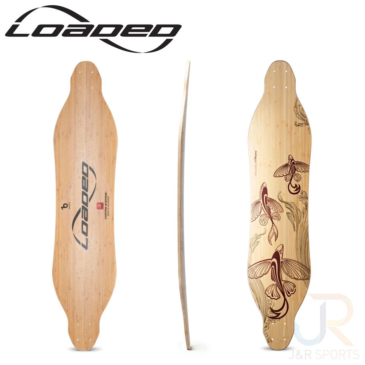 No Lift Ticket Required! Snowboard Style Freeriding at its Finest! The Vanguard longboard from Loaded brings lightweight snowboard-inspired construction and performance to the pavement. Camber, sidecuts, and high-energy flex allow for responsive carving, pumping, and commuting. With a symmetrical shape and stance for a balanced centre of gravity as well as the ability to weight and unweight the deck through turns for control and efficient energy generation, this performance downhill Loaded Vanguard board will change the way you experience topography. Specifications: Length: 38IN or 42IN / 98 or 107 cm Width: 8.5IN / 21.5 cm Wheelbase: 35 and 31.5IN / 88.9 and 80 cm Deck Weight: 2.7-3.8 lbs / 1.2-1.7 kg Profile: Camber Trucks: Paris V3 180mm 50Β° Trucks Wheels: Orangatang 75mm In Heat Wheels Bearings: Loaded Jehu V2 Bearings Hardware: Loaded 1IN Button Head Hardware Flex 5: 38IN Medium Stance: 70-160+ lbs / 31-72+ kg Flex 4: 38IN Medium Stance: 100-170+ lbs / 45-77+ kg Flex 3: 38IN Medium Stance: 140-200+ lbs / 64-90+ kg Flex 2: 42IN Wide Stance: 150-210+ lbs / 68-95+ kg Flex 1: 42IN Wide Stance: 175-230+ lbs / 80-105+ kg FUNCTIONAL DESIGN β Tapered shape maximizes wheel clearance for deep carves and tight turns. Sidecuts reduce torsional stiffness between the feet for greater nuances in the turning radius. Mild concave provides edge-to-edge control, while the topmount and cambered platform provides energetic carving performance. CURVACEOUS CONFIDENCE β Lightweight, snowboard-inspired bamboo and fiberglass construction pair with a cambered profile for a lively and engaging ride. LIGHT & DURABLE β Available in two sizes and five flex ratings to tailor the ride to your stance, weight, and style. Lower flex is ideal for heavier riders; higher flex is recommended for lighter riders or those looking for a more responsive board. SUPER SAP β Bio-based epoxy by Entropy Resins. Uses bio-based materials from industrial waste streams such as tree sap to replace petroleum content and reduce the carbon footprint of the epoxy from manufacturing. Loaded have worked closely with Entropy to enhance every major performance characteristic of the resin. Better for the planet, even more fun.